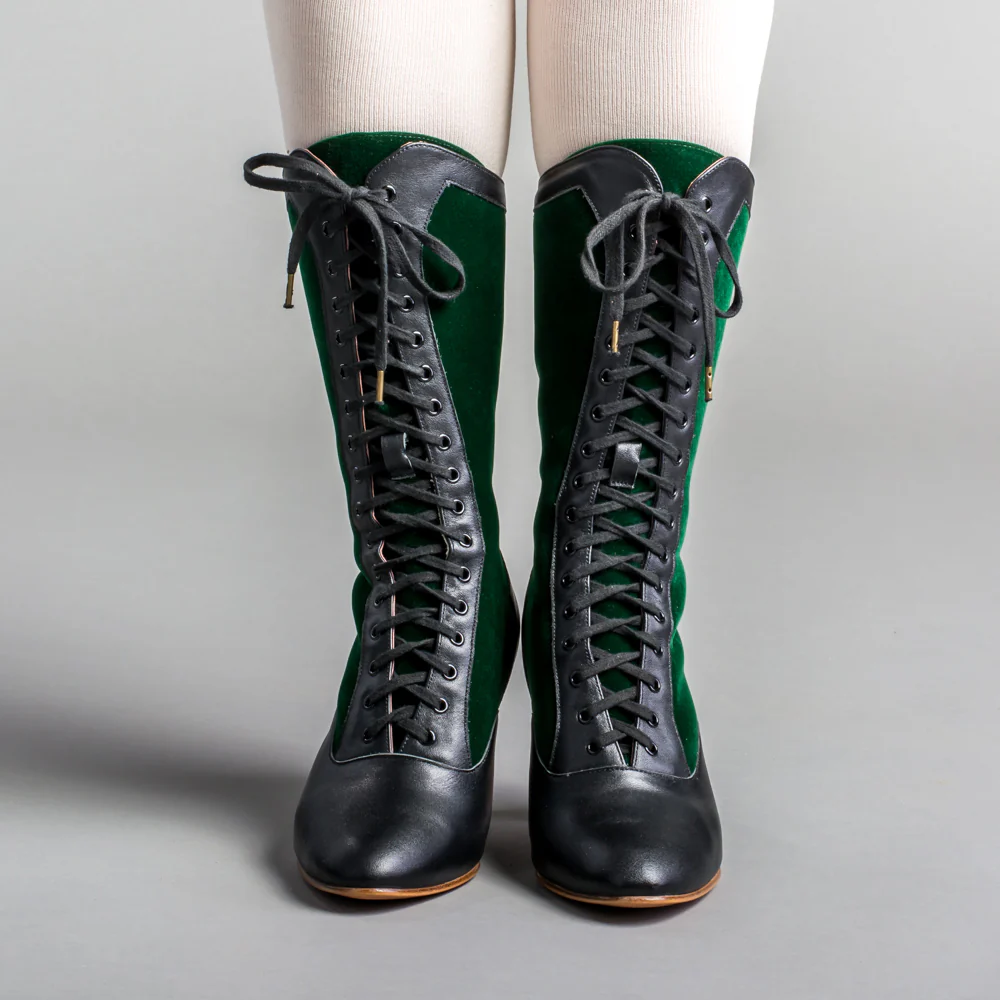 These tall boots feature a shaped top, leather foxing throughout, and a gorgeous 3 in / 7.6 cm French heel. Wear these beautiful boots with both historic dress and modern attire for a splendidly turn-of-the-century look with interesting details and gorgeous materials. The Camille boots, named after Camille Clifford, are perfect for reenactment, Can-Can, Goth, Lolita, and Western dress.