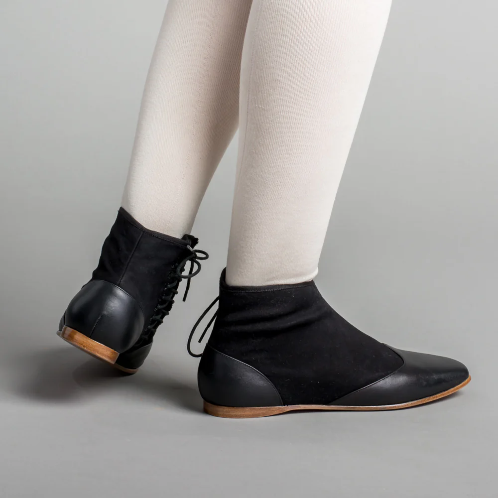 This popular style of Victorian ankle boot is made of a refined yet sturdy cotton sateen upper foxed with smooth calf leather on the toes and heels. The side-lace closure, unique to this period, makes it easy to get your boots on and adjusted just as you like. Wear Keckley Victorian boots for both day and evening dress, outdoor or indoor events, or with modern outfits for a secret nod to the past.