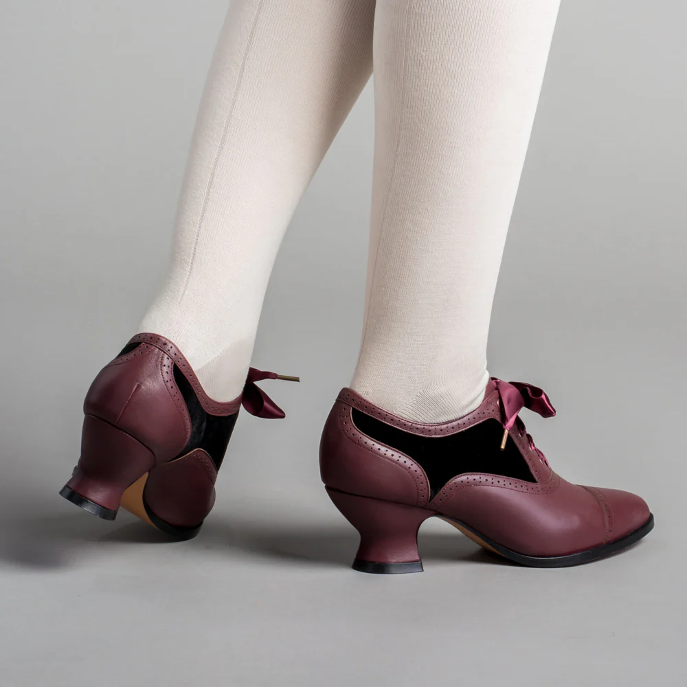 It's hard to go wrong with leather and velveteen, and the Lucille oxfords pair the two perfectly. Made on our best-selling and most beloved Edwardian oxford last and heel, the Lucille Edwardian Oxfords are perfect for the turn of the 20th century all the way through the mid-1920s.
