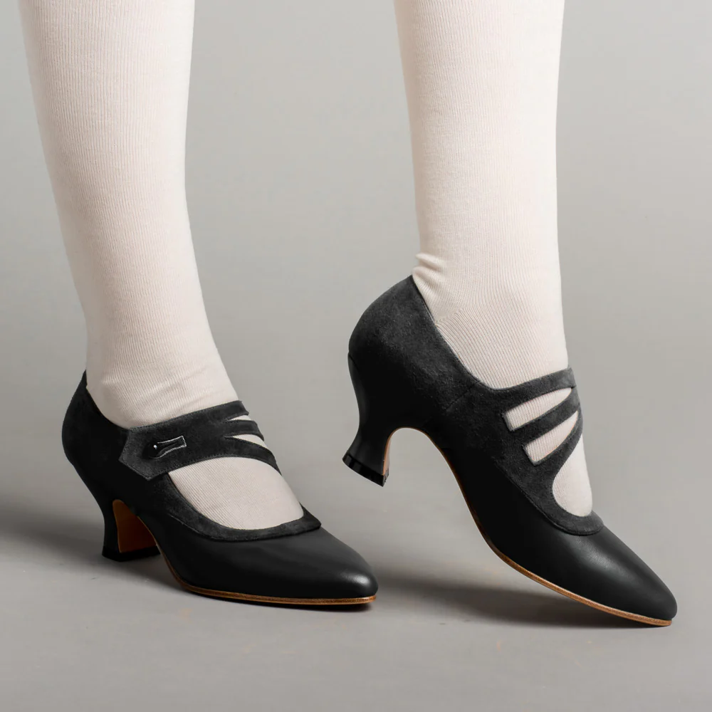Developed directly from an original 1900s design, the Mae feature tone-on-tone suede and smooth leather with a sophisticated Mary Jane strap crossing elegantly over the instep. The 2.25 in / 5.7 cm French heel is delicate and well-balanced, paired with a pointed toe to create the perfect Edwardian and 1920s silhouette.
