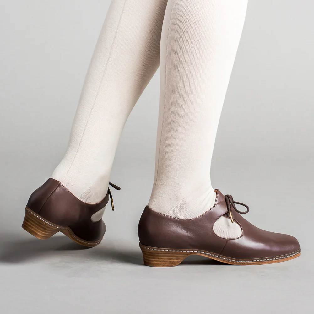 The unique styling of Elizabethan and Renaissance heeled shoes is brought to life with our Mary. A tie closure, open sides, and a low, practical heel makes these late Renaissance era shoes perfect for both indoor and outdoor fairs and events.